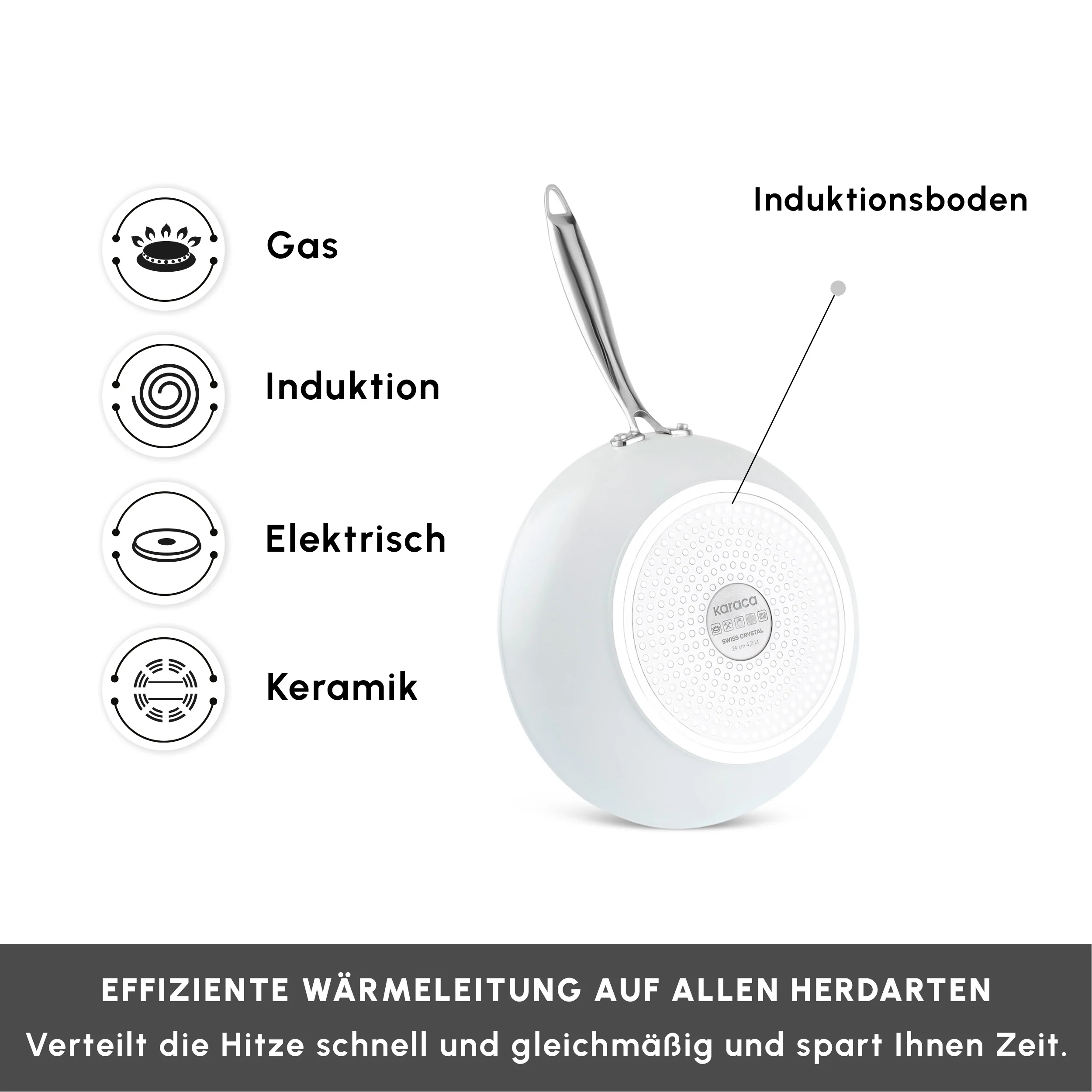 Ein brandneues Pfannenset mit hervorragenden Antihafteigenschaften: SwissCrystal Das Karaca SwissCrystal Pfannenset, das seine Stärke aus der antihaftbeschichteten SwissCrystal Oberfläche bezieht, bietet Ihnen die Möglichkeit, eine Reihe von Gerichten auf praktische Weise zuzubereiten, wie z.B. Eier, Fisch, Huhn, und das alles ohne Öl. Die Antihaftbeschichtung wird mit Schweizer Kristallen hergestellt und enthält keine gesundheitsschädlichen chemischen Verbindungen wie „PFAS“. Das SwissCrystal Pfannenset ist zudem leicht zu reinigen! Egal, welches Gericht Sie zubereitet haben, Sie brauchen es nur kurz unter Wasser abzuspülen. Die wesentlichen und praktischen Eigenschaften des SwissCrystal Pfannensets erleichtern Ihnen die Zubereitung schmackhafter Gerichte und sorgen für eine einfache Handhabung in Ihrer Küche.